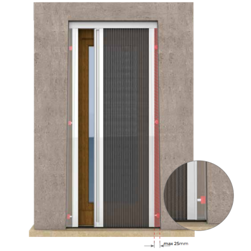 Uno dei principali punti di forza di questa zanzariera è lo spessore complessivo di soli 22 mm, unito a una struttura pensata per rendere l’installazione semplice e intuitiva. In caso di pareti non perfettamente in squadra, è possibile intervenire con un compensatore laterale (optional) che permette di correggere eventuali fuori squadra fino a 25 mm.